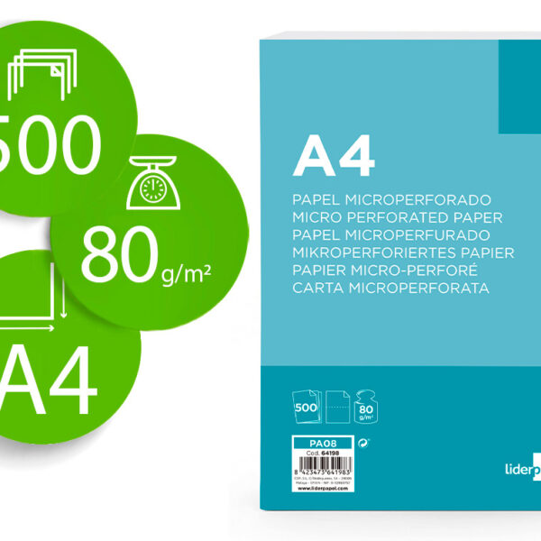 PAPEL LIDERPAPEL DIN A4 80 GR BRANCO MICROPERFURADO EM DUAS PARTES IGUAIS EMBALAGEM DE 500 FOLHAS