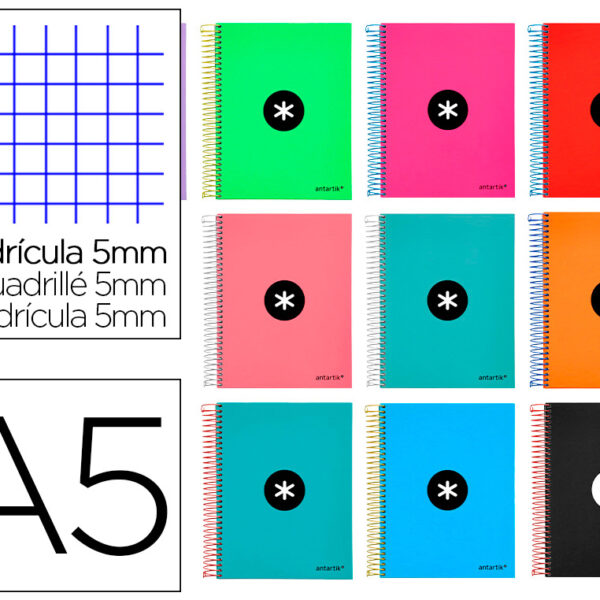CADERNO ESPIRAL DIN A5 ANTARTIK CAPA FORRADA 120 F 90 GR QUADRICULA 5 MM 5 BANDAS 6 FUROS CORES SORTIDAS