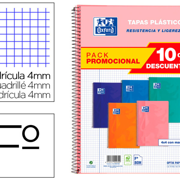 CADERNO ESPIRAL OXFORD CAPA PLASTICO FOLIO 80 FOLHAS QUADRICULA 4 MM PACK 5 UNIDADES CORES TENDENCIAS